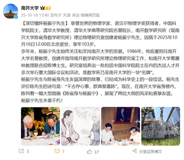 刚刚,南开大学发文深切缅怀杨振宁先生。全文如下: